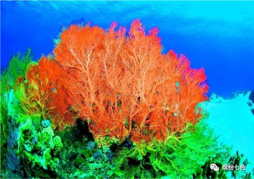 珊瑚五光十色真美啊!有綠的、紅的、白的、藍的、黑的......你看,綠的如玉,紅的似火,白的像雪,藍的像天,黑的發亮,像黑寶石一樣。真漂亮!